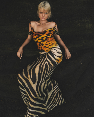 The plunging neckline, accentuated by a double-knot detail, adds a touch of effortless elegance. In a stunning blend of deep reds, soft grays, and rich blues, this edition of Victoria embodies the untamed beauty of the savanna.